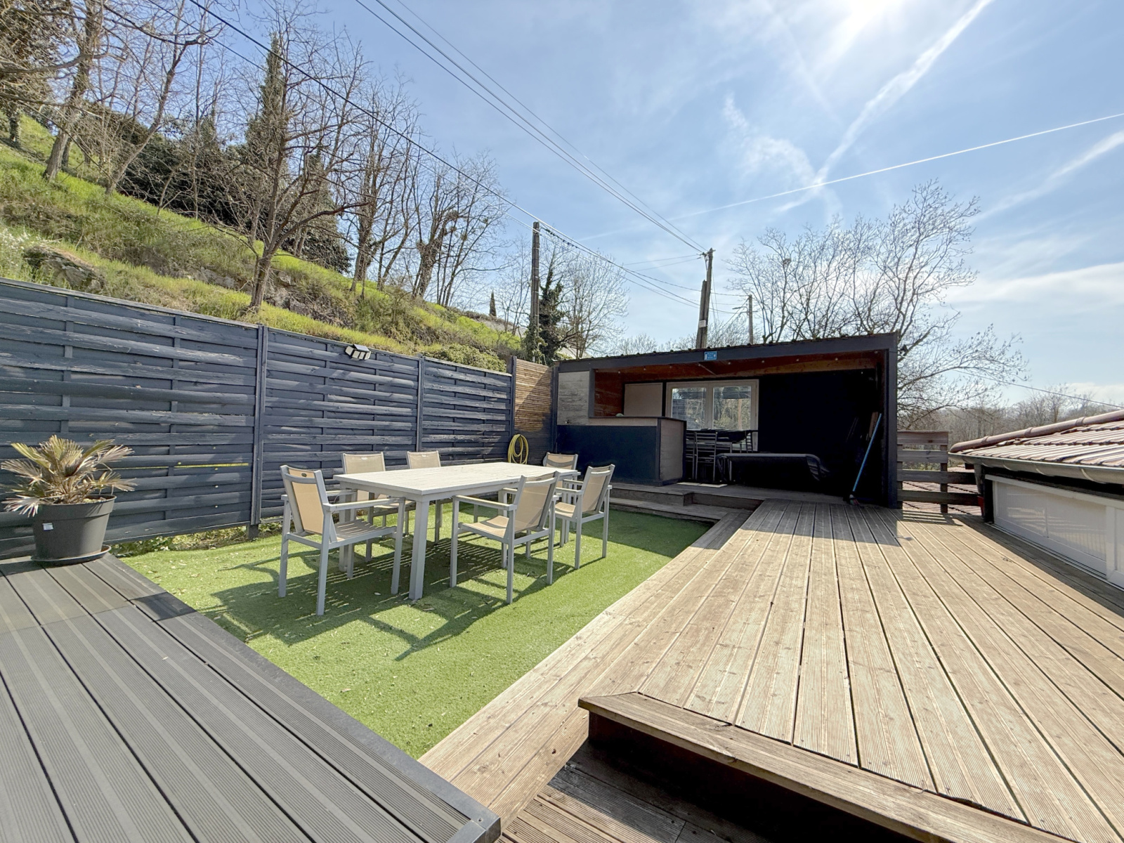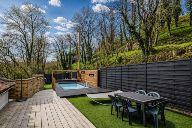 Légny (69620)Implantée à l'entrée des Ponts-Tarrets, charmante maison comprenant un T3 en duplex et un T2 indépendants, chacun avec sa terrasse privative. En partage : un superbe espace été avec piscine et pool-house sur terrain clos d’env. 275 m².